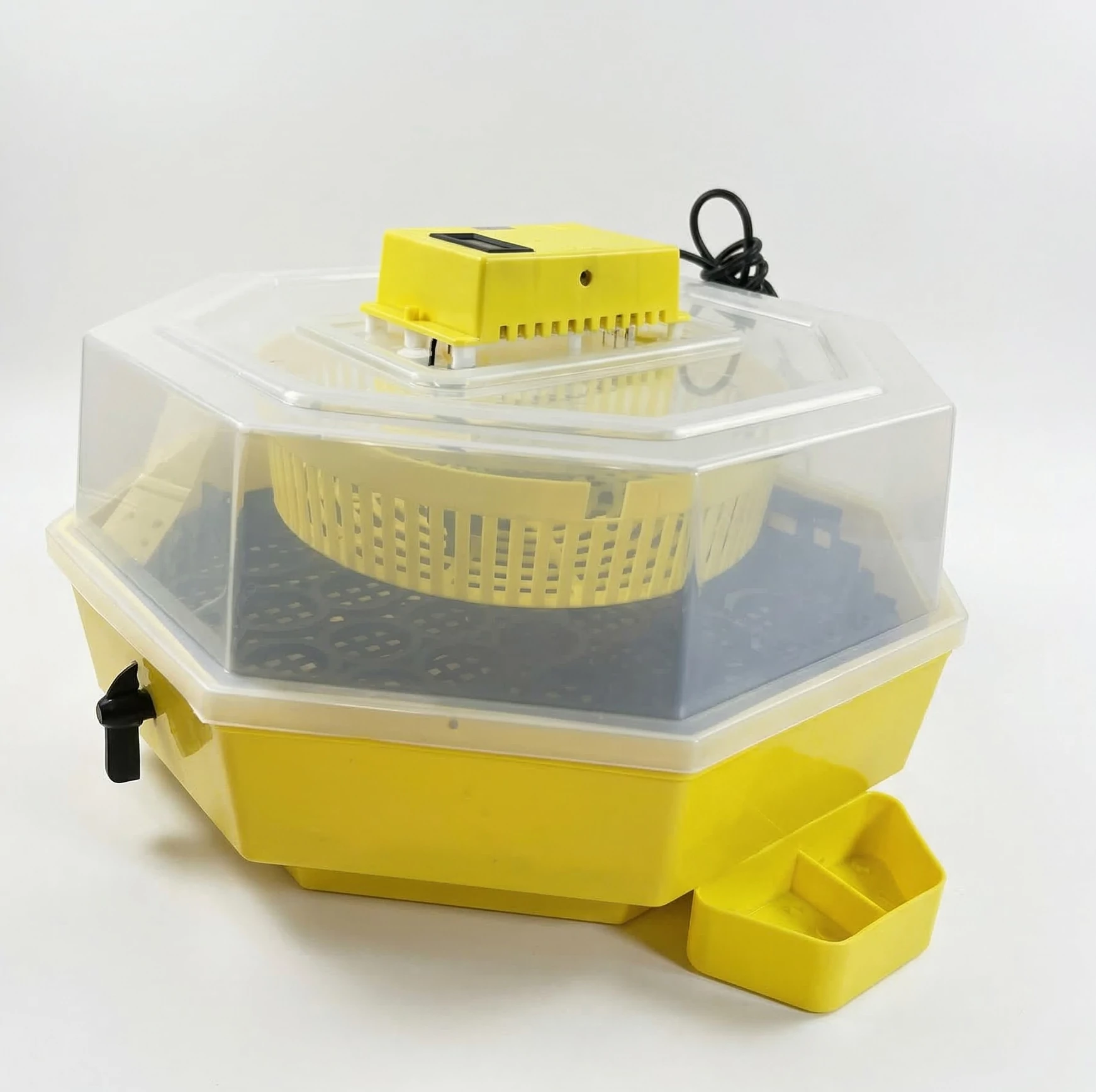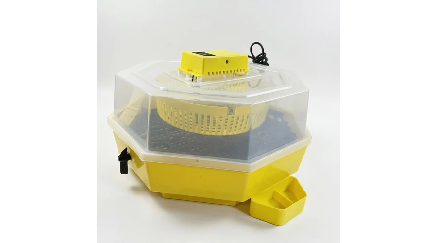 Tyúktojásból 41db keltethető a forgatóművel, nélküle tojásmérettől függően 50-60db. Kezelése egyszerű. A forgatás a gép külső oldalán lévő kis karral végezhető.